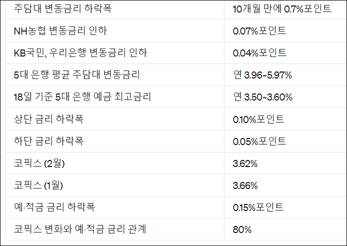 주담대 변동금리의 하락은 코픽스의 하락과 밀접한 관련이 있습니다. 코픽스는 국내 주요 은행들이 자금을 조달하면서 부담하는 금리의 평균치를 나타내며, 이 지수가 하락하면 주담대 변동금리도 하락하는 경향을 보입니다. 최근 코픽스는 3개월 연속 하락하여, 2월 기준으로 3.62%로 전월 대비 0.04% 포인트 하락했습니다.