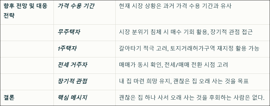 전문가들은 현재 시장 상황을 과거 가격 수용 기간과 유사하다고 평가하며, 무주택자에게는 오히려 매수 기회가 될 수 있다고 조언합니다. 토지거래허가구역 재지정으로 인해 시장 분위기가 얼어붙으면서 급매물이 나올 가능성이 있고, 단기적인 급등락에 일희일비하기보다는 장기적인 관점에서 접근하는 것이 중요합니다. 1주택자라면 갈아타기를 고려해볼 만합니다. 어차피 실거주 목적이라면 토지거래허가구역 재지정이 오히려 좋은 기회가 될 수 있습니다. 중요한 것은 괜찮은 집을 하나 사서 오래 사는 것이며, 이를 후회하는 사람은 거의 없다는 점을 기억해야 합니다.