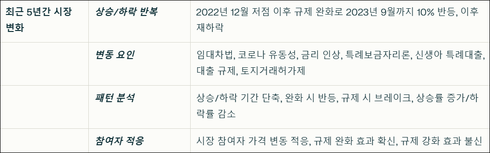 지난 5년간 서울 아파트 시장은 규제 완화와 강화에 따라 등락을 반복해왔습니다. 2022년 12월 저점을 찍은 후, 특례보금자리론 출시와 같은 규제 완화 정책에 힘입어 2023년 9월까지 약 10% 반등했습니다. 하지만 이후 대출 규제가 강화되면서 상승세가 꺾였고, 2024년 2월까지 다시 10% 하락했습니다. 최근에는 신생아특례대출과 토지거래허가구역 해제 등의 영향으로 다시 상승세를 탔지만, 토지거래허가구역 재지정으로 인해 상승세가 둔화될 가능성이 커졌습니다. 이처럼 시장은 정책 변화에 민감하게 반응하며 단기적인 변동성을 키우고 있습니다.