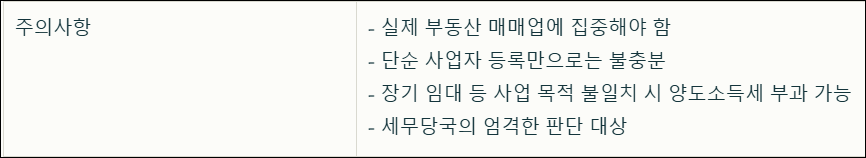 둘째, 매매업의 취지에 맞게 단기 거래에 집중해야 합니다. 장기 보유나 임대 위주의 운영은 사업소득으로 인정받기 어려울 수 있습니다.