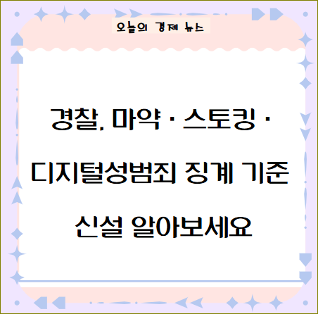 | 2. 마약, 스토킹, 디지털성범죄 징계 기준 신설 - 경찰관이 마약 범죄에 연루될 경우, 사소한 경우라도 최소 해임 이상의 처분을 받습니다. - 스토킹 범죄는 심각한 고비난성인 경우 최고 수위의 징계가 적용됩니다. - 디지털성범죄 관련 행위는 허위영상물 유포나 협박·강요 등 경미한 사례를 제외하고는 대부분 배제 징계됩니다. |