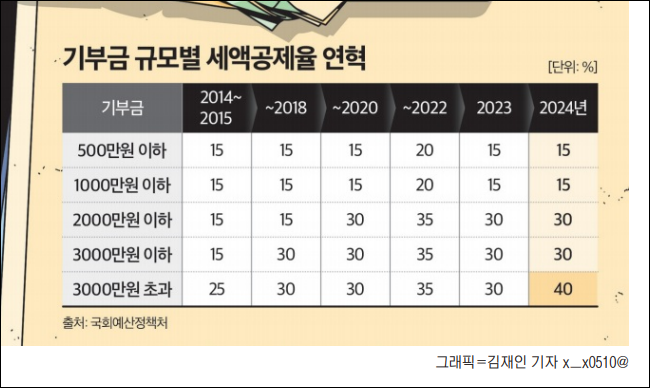 | 기부금 세액공제 변화 추이 | - 2013년 이후 기부금 세액공제 혜택이 축소되었으나, 2021년부터 5% 상향 조정 - 2024년부터는 기존 30% 공제율 적용 예정 |