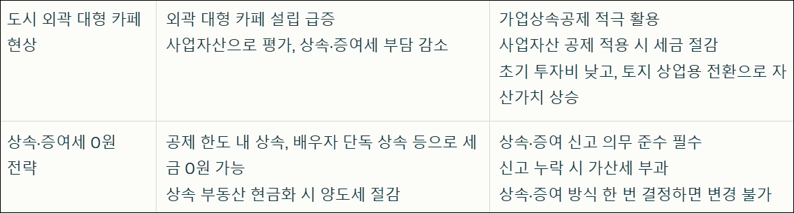 최근 도시 외곽에 초대형 베이커리 카페가 급증하는 현상도 주목받고 있습니다. 이는 단순한 사업 확장이 아니라, 상속세와 증여세 부담을 줄이기 위한 재무 전략과 밀접하게 연관되어 있습니다. 외곽 지역은 초기 투자비가 낮고, 대규모 부지 확보가 쉬워 사업자산으로 평가받기 용이합니다. 대형 카페를 설립하면 토지의 용도가 상업용으로 바뀌고, 자산 가치가 상승하는 동시에 상속세 계산 시 사업자산 공제를 활용할 수 있습니다. 특히 가업상속공제 제도를 적극적으로 이용하면, 단순 토지 상속에 비해 세금 부담을 크게 줄일 수 있습니다. 이는 30억 원 초과 자산에 최고 50%까지 부과되는 상속세율을 감안할 때, 자산가들이 선호하는 절세 전략입니다.