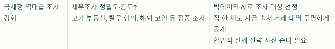 2025년 국세청은 세무조사 건수를 1만 4천 건 수준으로 유지하면서도, 조사 강도와 정밀도를 대폭 높였습니다. 특히 고가 아파트 등 주거용 부동산에 대한 감정평가를 확대하고, 탈루 혐의가 명백한 사안에 대해 비정기(특별) 세무조사를 적극 실시합니다. 조사 대상 선정에는 빅데이터와 인공지능(AI)이 활용되며, 특수관계자와의 부당거래, 호화·사치생활, 불법 다단계, 해외 코인 수익 탈루 등도 집중적으로 감시합니다. 올해부터는 집 한 채라도 자금 출처, 거래 내역, 상속·증여 내역까지 모두 국세청에 투명하게 드러나므로, 사전에 꼼꼼한 준비와 합법적인 절세 전략이 필수입니다.