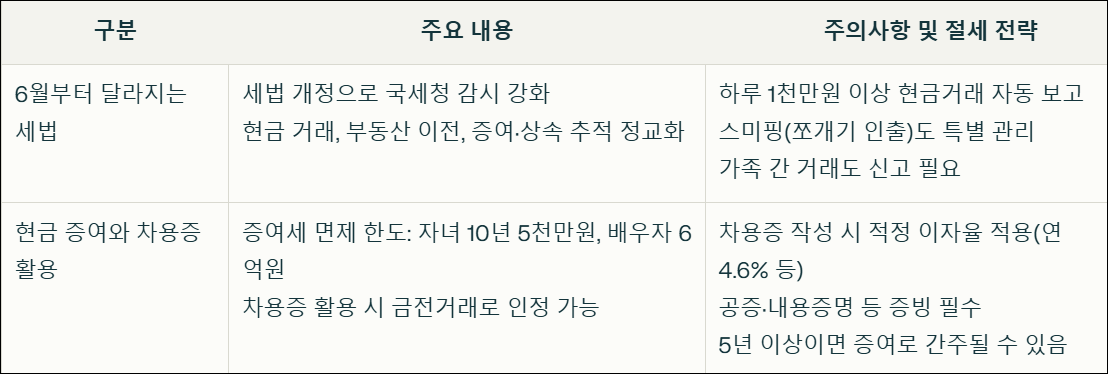 2025년 6월부터 세법이 대폭 개정되면서 국세청의 감시가 한층 강화됩니다. 특히 가족 간 현금 거래, 부동산 이전, 증여와 상속 등 자산 이동에 대한 추적이 더욱 정교해졌습니다. 하루에 1천만 원 이상 현금 거래는 금융정보분석원에 자동 보고되고, 이를 나눠서 인출하는 행위(스미핑)도 국세청이 특별 관리합니다. 단순히 현금으로 주고받는다고 해서 추적을 피할 수 있는 시대는 끝났습니다. 실제로 가족 간의 결혼자금이나 병원비 등 명목으로 현금을 나눠서 지급했다가 증여세와 가산세까지 부과된 사례가 속출하고 있습니다.