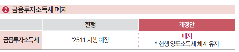 금융투자소득세는 2025년 1월 1일 시행 예정이었으나, 폐지됩니다. 현행 양도소득세 체계를 유지하여 투자자들의 부담을 줄이고 자본시장 활성화를 도모합니다.
