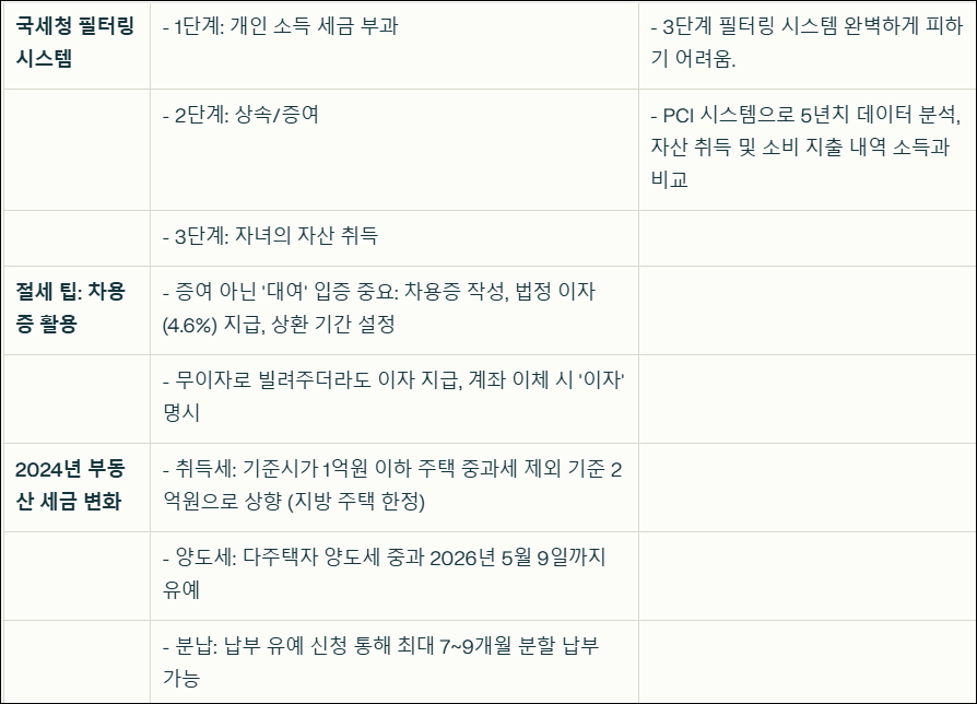 국세청은 개인 간의 소소한 거래를 일일이 파악하기 어렵습니다. 하지만 3단계 필터링 시스템을 통해 탈세 혐의를 포착합니다. 1단계는 월급, 사업소득 등 개인 소득에 대한 세금 부과, 2단계는 상속 증여, 3단계는 자녀의 자산 취득입니다. 은밀하게 증여한 돈은 결국 자녀의 자산 취득으로 드러나게 됩니다. 국세청은 PCI 시스템(Property, Consumption, Income)을 통해 개인의 5년치 데이터를 분석, 자산 취득 및 소비 지출 내역을 소득과 비교하여 탈세 혐의를 포착합니다.