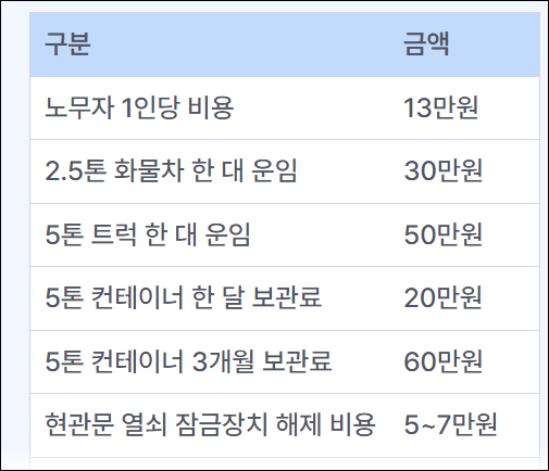 A5: 운반비의 경우 2.5톤 화물차 한 대를 빌리는 데는 30만원 가량을, 5톤 트럭은 한 대에 50만 원가량을 운임으로 지불해야 합니다. 보관료는 5톤 컨테이너 한 대를 한 달 빌리는데 20만 원가량이 소요되며, 대부분의 경우 보관료는 3개월분을 미리 내야만 합니다. 즉, 5톤 컨테이너 한 대를 빌리기 위해선 일단 60만 원을 지불해야만 합니다.