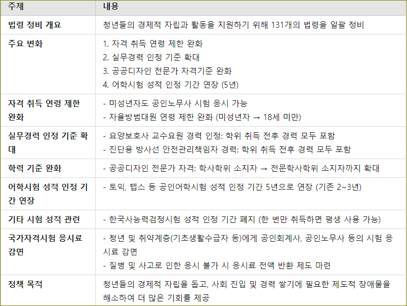 주요 변화 중 하나는 자격 취득을 위한 연령 제한 완화입니다. 예를 들어, 미성년자도 특정 전문 자격시험에 응시할 수 있도록 법이 개정되었고, 자격을 취득하기 위한 실무경력 인정 기준도 넓어졌습니다. 이를 통해 청년들이 빠르게 자신의 자격을 취득하고, 더 나은 직업 기회를 잡을 수 있도록 여건이 마련되었습니다.