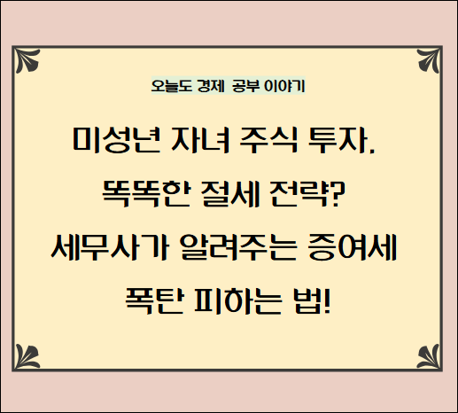 자녀에게 주식 증여, 똑똑한 절세 전략인 줄 알았는데 세금 폭탄이라니?! 2000만원 증여 후 3000만원 수익 냈다가 낭패 볼 뻔한 이야기가 바로 내 얘기라면? 미성년 서학개미라면 반드시 알아야 할 증여세 꿀팁, 지금 바로 확인하고 안전하게 자산 증식하세요! 홈택스 신고 방법부터 차명계좌 판별법까지, 세금 걱정 없이 똑똑하게 증여하는 방법, 제가 알려드릴게요!