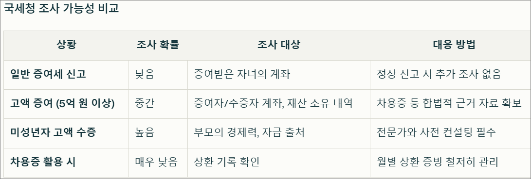 많은 사람들이 증여세 신고 시 국세청에서 계좌를 조회하거나 부모님의 경제적 능력까지 조사할까 봐 걱정합니다. 그러나 일반적인 증여세 신고에서는 국세청이 계좌를 조회하지 않습니다. 다만, 미성년자가 고액의 재산을 받는 경우처럼 경제적 능력이 명백히 부족한 사례에서는 추가 조사가 이루어질 수 있습니다. 예를 들어, 미성년자가 기준 시가 5억 원짜리 토지를 증여받았다고 가정하면, 해당 미성년자가 납부해야 할 증여세를 감당할 능력이 없기 때문에 국세청에서 자금 출처 조사를 진행할 가능성이 있습니다. 하지만 성인이거나 경제적 능력이 충분히 입증된 경우에는 이러한 우려가 크지 않습니다. 따라서 합법적으로 신고된 경우 불필요한 걱정을 할 필요는 없습니다.