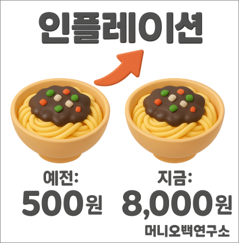 "이게 바로 인플레이션이야. 시간이 지나면서 물건값이 계속 오르는 현상이지. 영어로는 Inflation, 우리말로는 물가상승이라고도 해."