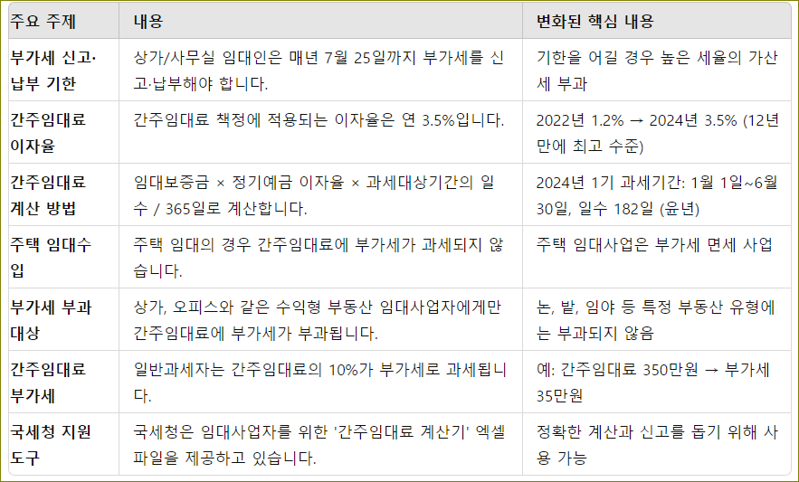 2024년 상가·사무실 임대인의 부가세 신고·납부 시즌이 도래했습니다. 올해 간주임대료 이자율이 12년 만에 최고 수준인 3.5%로 상승하여, 임대인들의 부가세 부담이 커졌습니다. 이번 글에서는 부가세 신고 기한, 간주임대료 계산 방법, 주택 임대수입 면세 등 꼭 알아야 할 주요 정보를 안내해드립니다.