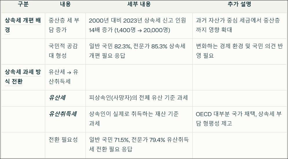 상속세 개편의 핵심은 과세 방식을 '유산세'에서 '유산취득세'로 전환하는 것입니다. 유산세는 피상속인(사망자)의 전체 유산을 기준으로 세금을 부과하는 방식인 반면, 유산취득세는 상속인이 실제로 취득하는 재산을 기준으로 세금을 부과하는 방식입니다. 설문조사 결과 일반 국민의 71.5%, 전문가의 79.4%가 유산취득세로의 전환이 필요하다고 응답했습니다. 유산취득세로 전환되면 상속인 각자의 상속 재산 규모에 따라 세금을 납부하게 되므로, 상속세 부담의 형평성을 높일 수 있다는 장점이 있습니다. 또한 OECD 대부분의 국가에서도 유산취득세 방식을 채택하고 있어, 국제적인 추세에도 부합하는 개편이라고 할 수 있습니다.