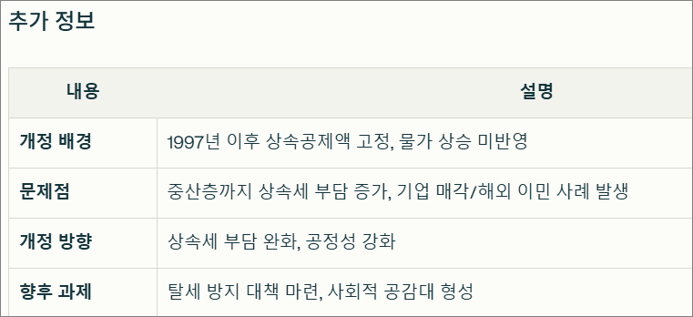 이번 상속세 개편은 단순히 법률 개정에 그치지 않고, 국민의 실생활에 큰 영향을 미칩니다. 예를 들어, 부모님이 부동산만 보유한 경우 상속세 납부를 위해 급매를 해야 했던 부담이 줄어들고, 상속인이 많을수록 세 부담이 경감됩니다. 또한, 상속 전에 사위, 며느리, 손자 등 법정 상속인이 아닌 가족에게 증여를 해도 절세 효과가 커져, 증여세와 상속세 부담을 분산할 수 있습니다. 다만, 증여세 공제 한도(부모-자녀 간 5천만 원, 배우자 6억 원 등)는 아직 개선이 필요한 상황입니다.