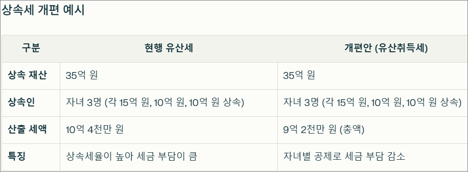 유산취득세 도입 시, 예를 들어 피상속인이 35억 원을 남기고 자녀 3명이 각각 15억 원, 10억 원, 10억 원을 상속받는 경우, 현행 유산세 방식에서는 10억 4천만 원의 산출세액이 발생하지만, 유산취득세 방식에서는 총 9억 2천만 원으로 세 부담이 줄어듭니다. 배우자와 자녀 각각에 대한 공제 확대와 과세표준 구간 조정(최고세율 50%에서 40%로 인하, 과세표준 구간을 30억 원 초과에서 10억 원 초과로 확대)도 함께 추진되어 상속세 부담 완화에 크게 기여할 전망입니다.