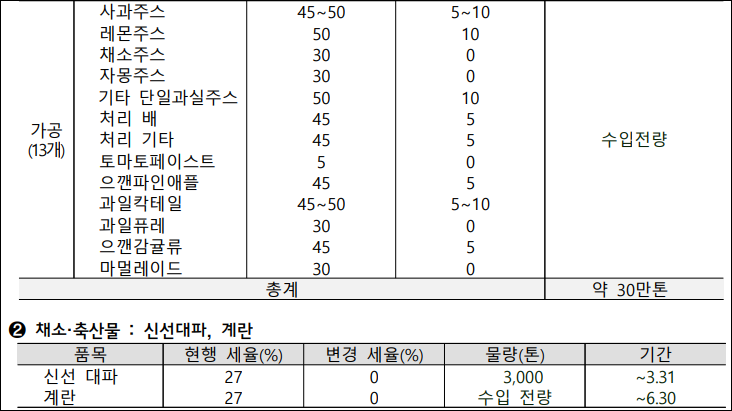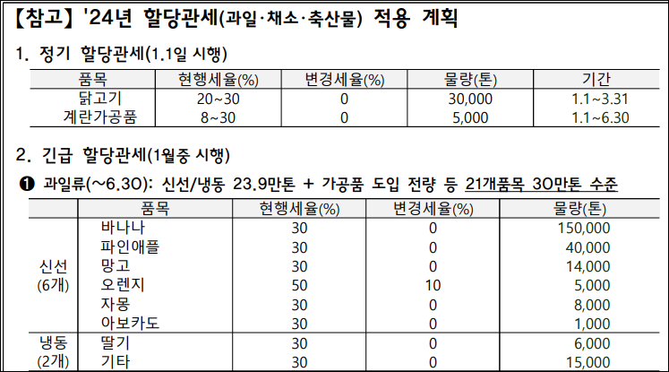 2024년 상반기 중 2%대 물가 조기 달성을 위해 범부처 총력 대응이 이루어질 예정입니다. 이를 위해 농축수산물 할인 지원, 에너지 바우처 등 물가 관리 및 대응 예산이 전년 대비 1.8조원 확대된 총 10.8조원으로 지원될 예정입니다. 또한, 주요 식품 및 원자재 할당 관세, 유류세 및 발전 연료 개소세 인하 등 세제 지원도 강화될 예정입니다. 착한가격업소는 연내 1만개로 확대되며, 배달료 지원사업도 신규로 추진됩니다. 과일 가격 안정을 위해 역대 최고 수준인 21종 관세 면제 및 인하를 통해 상반기 중 30만톤을 신속하게 도입할 예정입니다. 채소 및 축산물 가격 및 수급 안정을 위해 대파, 건고추, 양파, 닭고기, 계란가공품 등 총 6만톤 수준을 도입할 계획입니다.