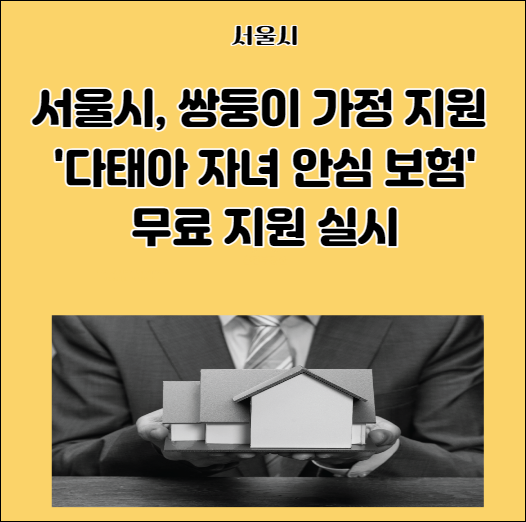 서울시는 2024년 1월 1일부터 쌍둥이 이상을 출산하는 가정에 '다태아 자녀안심보험'을 무료로 제공한다고 발표했습니다. 이는 오세훈표 저출생대책의 일환으로, 별도의 가입 절차 없이 자동으로 가입됩니다. 보장내용은 응급실 내원비, 특정전염병 진단비, 골절 수술비 등이 포함되며, 최대 3,000만 원까지 보장받을 수 있습니다.