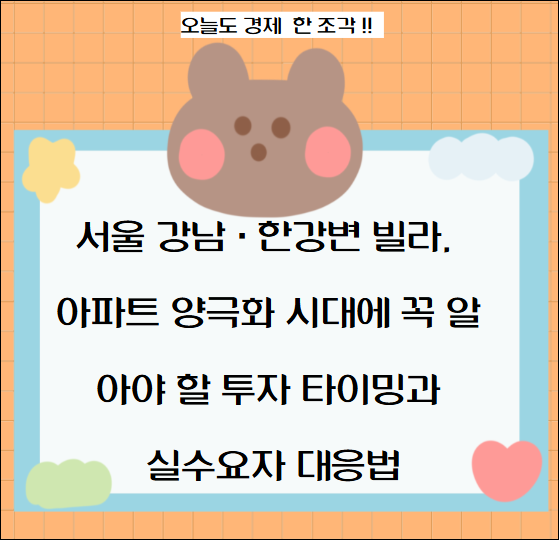 | 투자/실수요자 | 실수요자: 20~30평대 매물 부족, 30평대 중 덜 오른 매물 매수 권장 | 투자자: 강남·용산 외 지역 아파트도 리스크 방어 측면에서 매수 가치, 재개발·재건축 포트폴리오 필수 | 빌라도 한강변·역세권·재개발 추진 지역 중심으로 저렴한 비용에 진입 |