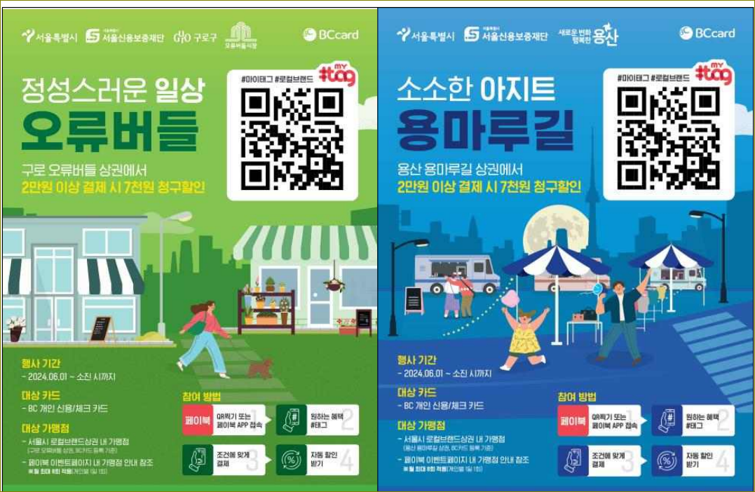 서울신용보증재단-비씨카드 로컬상권 프로모션 추진 : 서울신용보증재단(이사장 주철수, 이하 재단)과 비씨카드 주식회사(대표이사 최원석, 이하 비씨카드)는 2024년 6월 1일부터 서울시 내 특정 로컬브랜드 상권에서 소비활성화를 위한 할인 프로모션을 시작한다. 이 프로모션은 구로구 오류동역 인근 오류버들 상권과 용산구 효창공원 앞역 인근 용마루길 상권을 대상으로 하며, 방문객이 비씨카드로 2만 원 이상 결제 시 7천 원의 청구할인 혜택을 받을 수 있다.