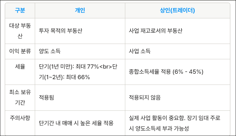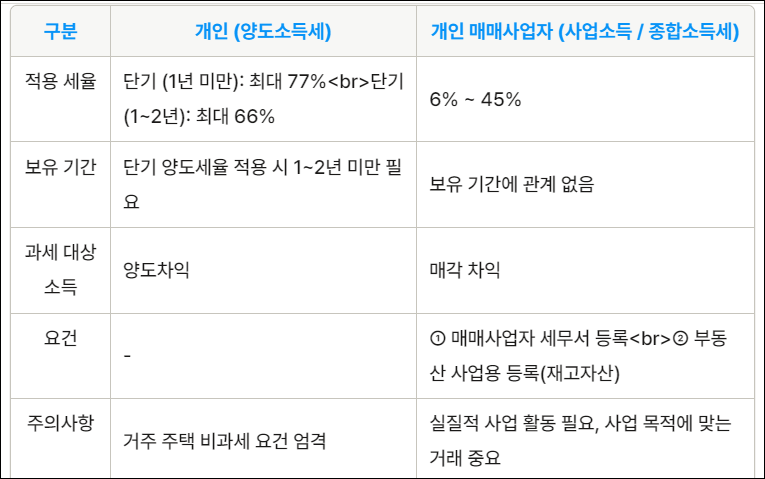 부동산 시장에서는 매매 활동을 통해 이익을 추구하는 개인 매매사업자들이 있습니다. 이들에게 적용되는 세금 체계는 일반적인 거주 주택 매각과는 다른 기준을 적용받습니다. 일반적으로 주택을 매각할 때 1년 미만 보유 시에는 70%, 1년 이상 2년 미만 보유 시에는 60%의 높은 단기 양도세율이 부과됩니다. 여기에 지방소득세까지 합하면 각각 77%, 66%의 세율로 세금 부담이 상당히 높아집니다. 반면, 개인 매매사업자가 부동산 매매를 사업으로 등록하고 활동할 경우, 이익은 사업소득으로 분류되어 양도소득세가 아닌 종합소득세가 적용됩니다. 이 경우에는 2년 이상의 보유 기간 요건이 사라지며, 차익에 따라 6%에서 45% 사이의 세율이 적용되어 상대적으로 유리할 수 있습니다.