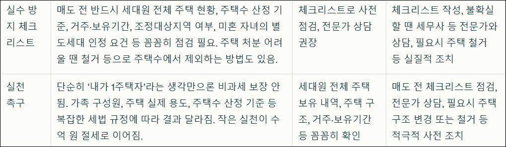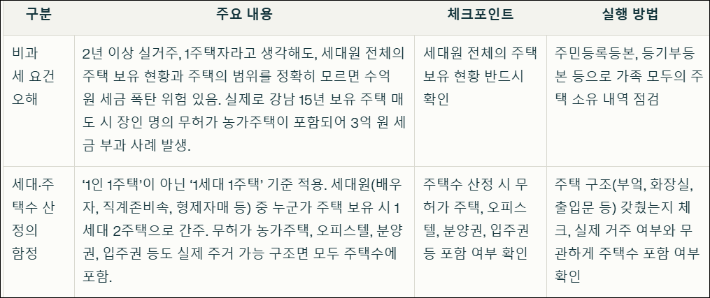 저도 이번에 1세대 1주택 비과세 제도를 깊이 공부하면서, 단순히 2년 넘게 살았다고 해서 무조건 비과세가 되는 게 아니라는 걸 확실히 알게 됐어요. 실제로 가족 중 누군가가 아주 작은 무허가 주택을 갖고 있어도 세대 전체가 2주택자가 되어 수억 원 세금 폭탄을 맞을 수 있습니다. 저 역시 주택을 팔기 전에 가족 모두의 주택 소유 현황을 꼼꼼히 확인하는 게 얼마나 중요한지 절실히 느꼈습니다. 제도상 주의할 점은 세대원 범위와 주택의 범위를 정확히 파악해야 한다는 것이고, 개선이 필요하다면 실질 거주 요건을 강화하고, 복잡한 규정을 더 명확하게 안내해주는 시스템이 마련됐으면 합니다. 여러분도 꼭 체크리스트로 미리 점검하고 전문가 상담을 권합니다.