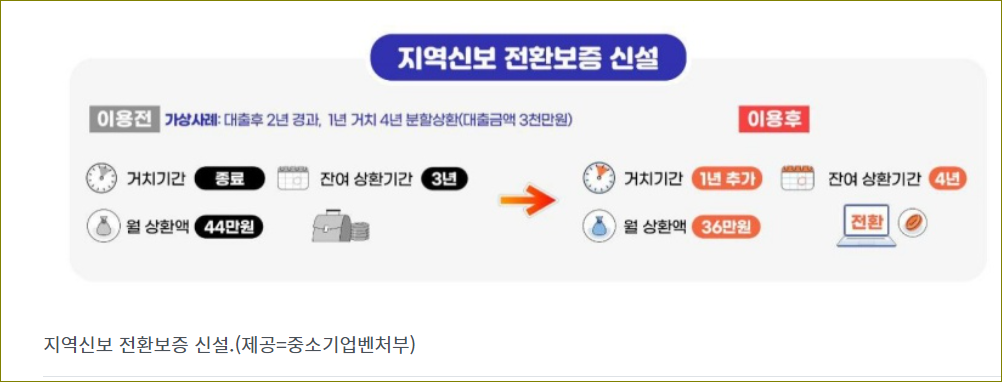 5조 원 규모로 신설된 전환보증은 기존의 지역신보 보증을 사용하여 대출받은 소상공인이 새로운 보증을 이용해 금융기관으로부터 추가 대출을 받을 수 있게 합니다. 이는 대출의 거치기간과 상환기간을 연장하여 소상공인의 부담을 경감시키는 효과를 가집니다.