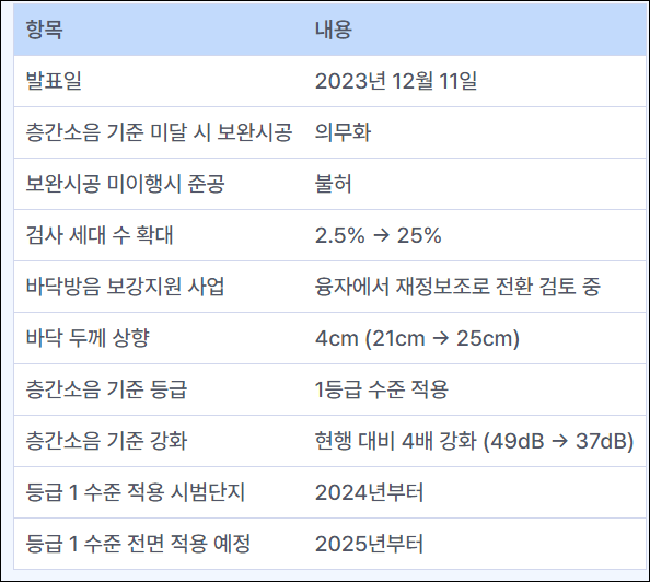 1. 층간소음 기준 미달 시 보완시공 의무화 및 준공 불허