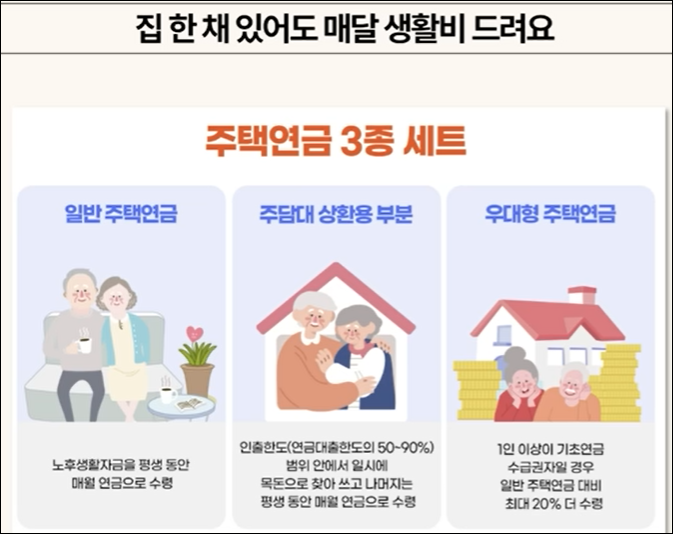 | 다양한 상품 유형 | 일반 주택 연금: 주택 가치를 활용하여 연금을 받는 방식. 주담대 상환용 주택 연금: 부모님의 집에 대출이 남아 있어도 연금을 받을 수 있는 방식. 우대형 주택 연금: 기초 연금 수급자에게 추가 혜택을 주는 연금 제도 |