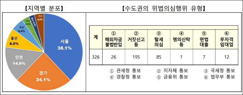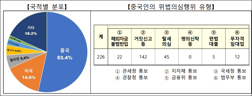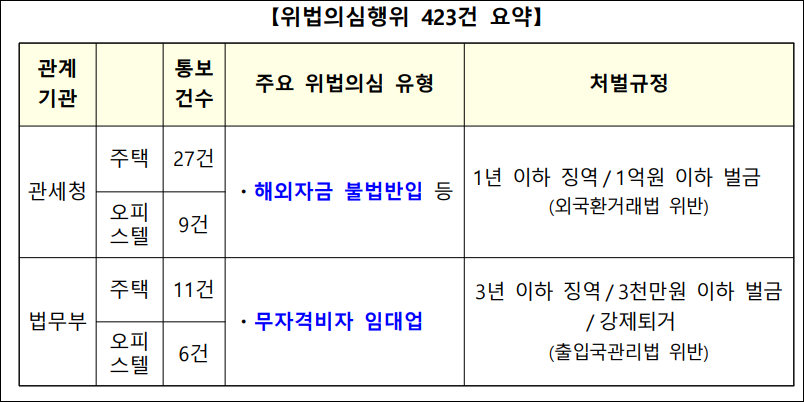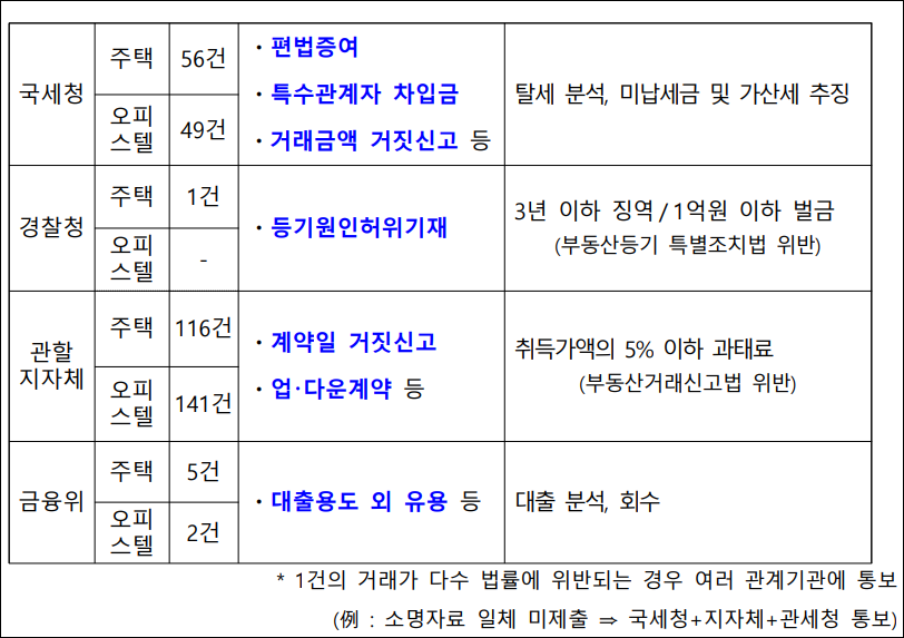 적발된 사항은 관계기관에 통보되었으며, 그중 국세청에는 편법증여 의심 등 105건, 관세청에는 해외자금 불법반입 등 36건, 지자체에는 신고가격 거짓신고 등 257건, 법무부에는 무자격비자 임대업 등 17건, 금융위에는 8건이 통보되었습니다. 이러한 결과는 외국인의 부동산 거래와 관련된 불법행위를 철저히 단속하고, 이를 바탕으로 관련 법률을 보다 효과적으로 시행하기 위한 근거로 활용될 것입니다.