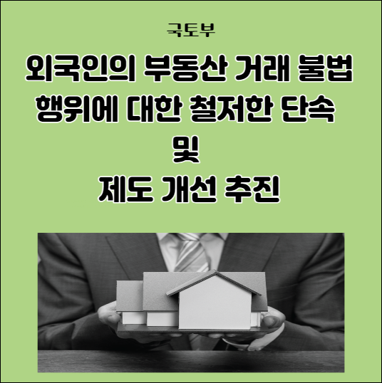 국토교통부는 외국인의 주택 및 오피스텔 거래 불법행위에 대한 실거래 기획조사를 진행하였고, 총 272건의 위법 의심 거래를 적발하였습니다. 이를 바탕으로 외국인의 투기성 거래를 근절하고 제도를 개선하기 위한 다양한 방안을 추진하였습니다. 앞으로도 외국인 부동산 거래에 대한 조사를 지속적으로 이어나가는 등 공정한 부동산 거래 질서 확립에 힘쓸 계획입니다.