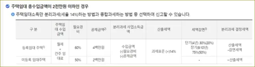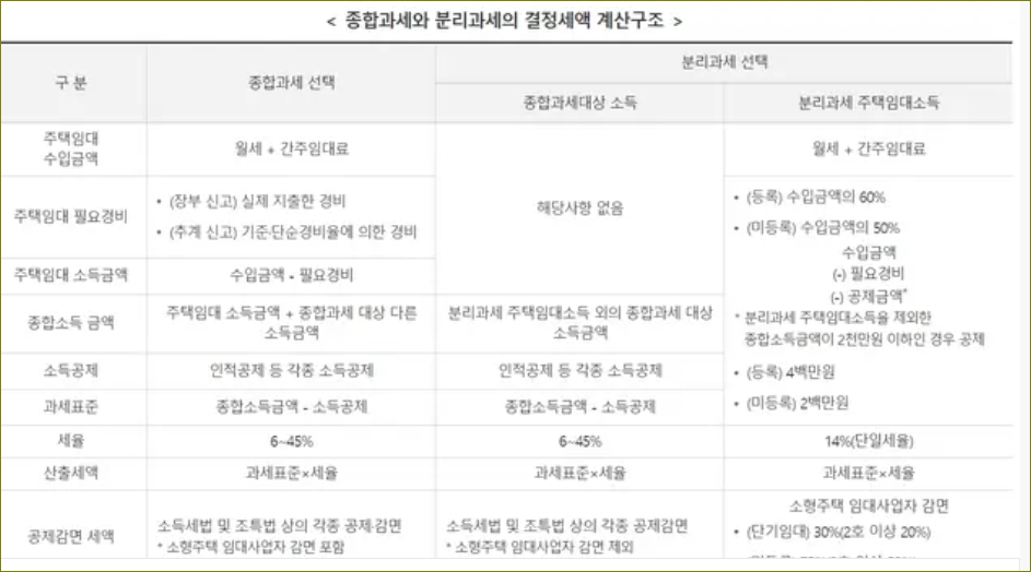 이와 같이, 주임사와 일반 임대인은 분리과세 시 적용되는 필요경비율, 소득공제, 세액감면 등에서 차이가 있으며, 이는 최종적으로 부과되는 소득세에 큰 영향을 미칩니다. 따라서 각 유형별로 세금 계산 방식을 정확히 이해하고 적절한 선택을 하는 것이 중요합니다.