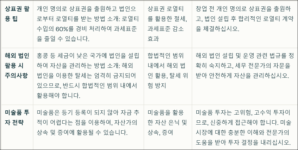 상표권 활용: 개인 명의로 상표권을 출원하고 법인으로부터 로열티를 받는 방법도 있습니다. 10억 원의 로열티를 받을 경우, 60%를 경비 처리하여 과세표준을 줄일 수 있습니다.