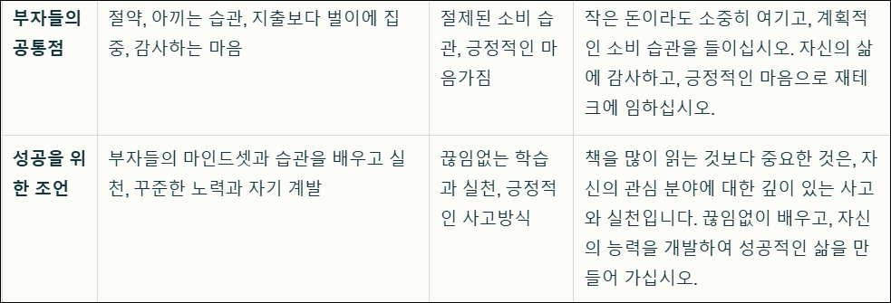 더 이상 부자들의 세계는 넘볼 수 없는 영역이 아닙니다. 10년 이상 100억 이상의 자산가들을 만나고 상담해 온 전문가들의 이야기를 통해, 부자들의 마인드셋과 습관을 배우고 실천한다면 여러분도 충분히 부의 추월차선에 합류할 수 있습니다. 망설이지 말고 지금 바로 행동하십시오. 당신의 미래는 당신의 손에 달려 있습니다.