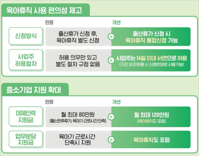 이번 육아휴직 제도 개정은 중소기업의 부담을 덜어주기 위한 여러 가지 지원책도 포함되어 있습니다. 육아휴직으로 자리를 비운 경우, 대체인력 지원금이 지급되며, 육아휴직에 대한 업무분담 지원금도 새롭게 신설됩니다. 중소기업의 경우, 인력 공백이 발생할 경우 업무 운영에 큰 어려움을 겪을 수 있는데, 이러한 지원이 큰 도움이 될 것입니다.