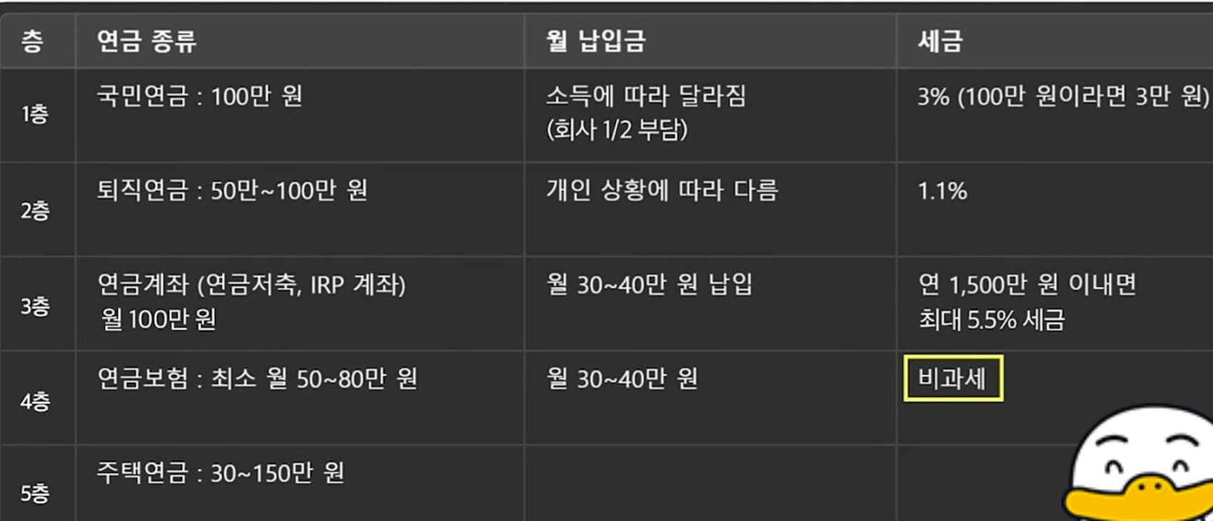 1층: 국민연금 (든든한 기본):납부액: 소득의 9% (월 300만원 소득 시 27만원, 본인 부담은 절반)예상 수령액: 2~30년 납입 시 월 100만원 (물가 상승률 연동)