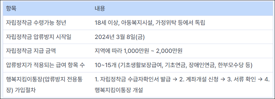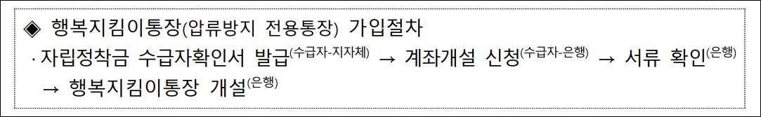 개선된 제도에 따라, 압류방지 전용통장인 '행복지킴이통장'을 새로 발급받거나 기존의 행복지킴이통장을 활용하여 자립정착금을 신청할 수 있게 되었습니다. 행복지킴이통장은 기초생활보장급여, 기초연금, 장애인연금, 한부모수당 등 압류방지가 적용되는 급여를 수급할 수 있는 통장으로, 가입절차는 자립정착금 수급자확인서 발급 후 계좌개설 신청, 서류 확인, 통장 개설 순입니다.