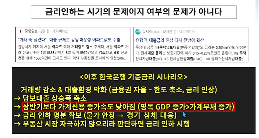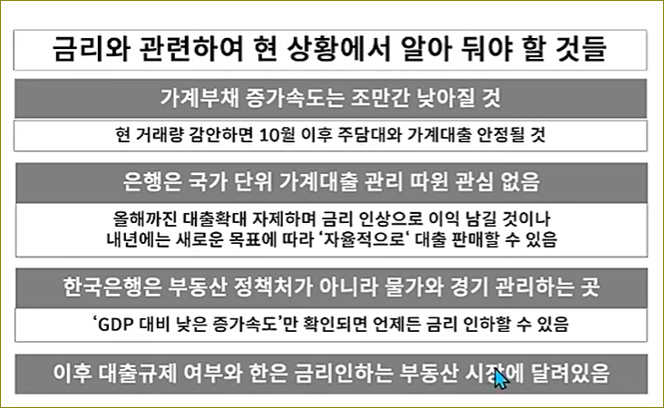 가계 부채의 증가 속도는 자본주의 사회의 본질적인 현상으로, 정부의 정책도 이 사실을 전제로 하고 있습니다. 가계 부채는 GDP 성장률보다 느린 속도로 증가할 수 있도록 관리될 것이며, 이는 향후 금리 인하와 대출 규제 완화 여부에 직접적인 영향을 미칩니다. 부동산 시장의 변화가 금리와 대출 규제의 결정 요인이 될 것이며, 따라서 개인 투자자들은 이러한 조정기를 활용하여 적절한 시기에 내 집 마련을 고려해야 할 시점입니다. 현재의 조정기가 향후 긍정적인 기회를 제공할 가능성이 있는 만큼, 개인의 상황에 맞는 전략적인 접근이 필요합니다.