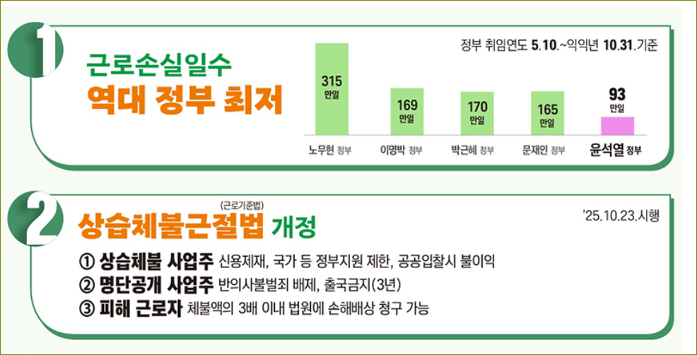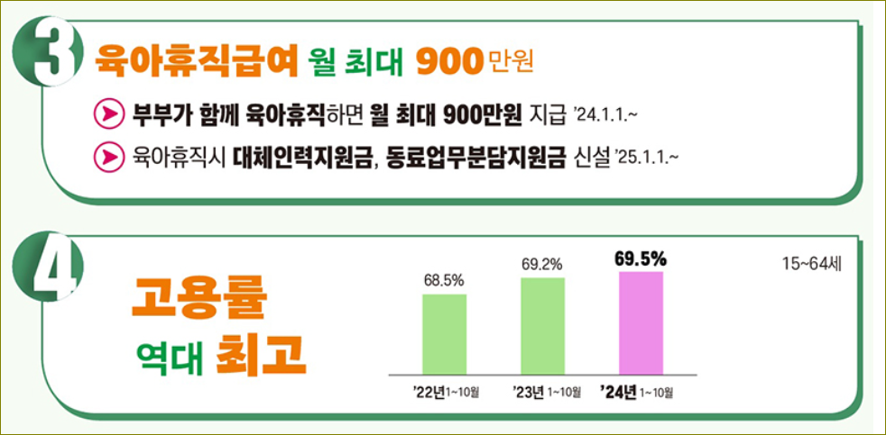 고용노동부는 저출생 문제 해결을 위해 육아휴직 제도를 대폭 확대하고, 고용률 증가 및 노동시장 안정화를 이루어냈습니다. 산업재해 예방을 위한 안전한 일터 조성과 노동약자 보호를 위한 법적 지원을 강화하며, 지속 가능한 정책을 통해 미래 세대를 보호하는 데 집중하고 있습니다