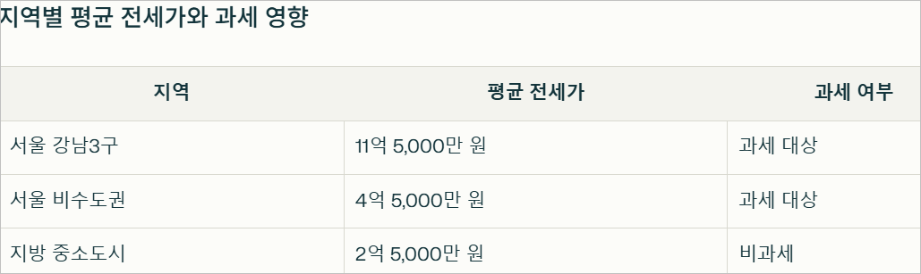 이번 정책의 영향은 지역별로 큰 차이를 보일 전망이다. 한국감정원 자료에 따르면, 서울 강남3구(강남, 서초, 송파)의 경우 평균 전세가가 11억 5,000만 원으로 전국 평균(3억 2,000만 원)의 3.6배에 달해 가장 큰 타격을 받을 것으로 예상된다. 반면 전세가 3억 원 미만인 지역은 기본공제액 범위 내에 들어 과세 대상에서 제외된다. 전문가들은 정책의 형평성을 높이기 위해 ①과세 기준을 주택 유형별(아파트/단독주택), ②지역별(수도권/비수도권), ③보증금 규모별로 차등화할 필요성이 있다고 지적한다. 또한 전세난 완화를 위해 공공전세주택 공급을 현재 15만 호에서 2027년까지 30만 호로 확대하는 등 보완 정책의 병행이 필수적이라는 의견이 제기되고 있다.