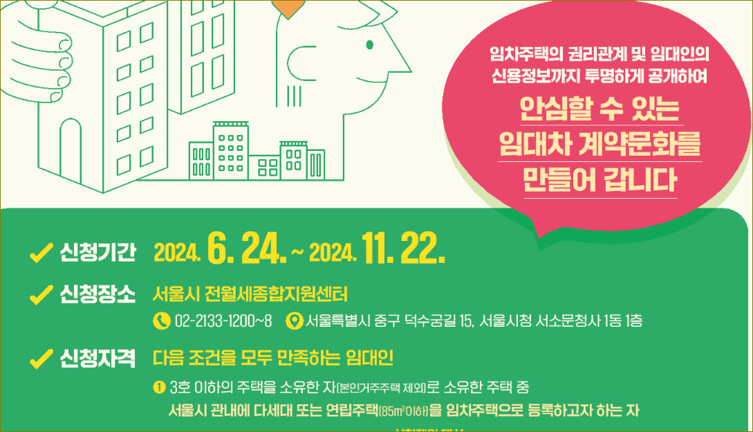 서울주거포털,서울특별시공고 제2024–1895호 「서울시 클린임대인 시범사업」신청자 모집 안내 서울시에서는 임차주택의 권리관계 뿐만 아니라 임대인의 신용정보까지 확인가능한 제도