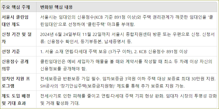 서울시는 전세사기 예방과 임대차 시장 활성화를 위해 '클린임대인' 제도를 도입했습니다. 신용점수 891점 이상을 가진 임대인을 선정하고, 이들의 매물에 '클린주택' 마크를 부여하여 임차인들이 안심하고 계약할 수 있도록 지원합니다. 이 글에서는 클린임대인 제도의 상세 내용과 신청 절차를 소개합니다.
