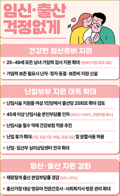 난임에 대한 불안감을 해소하기 위해 25∼49세 희망하는 모든 남녀 대상으로 최대 3회 가임력 검사를 지원하고, 가임력 보전이 필요한 남녀에게는 생식세포 동결·보존비도 지원한다. 난임부부에 대해서는 난임 시술의 건강보험 본인부담률을 30%로 인하하고, 난임시술 지원을 여성 1인당에서 출산당 25회로 확대한다. 또한, 자연분만과 동일하게 제왕절개 무료화도 추진한다.