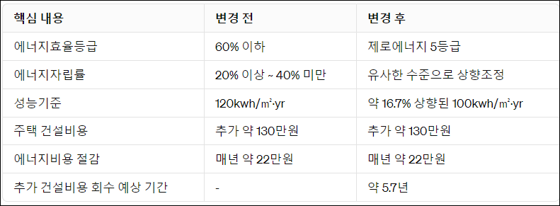 이번 개정안에서는 민간 공동주택을 대상으로 제로 에너지건축물을 적용하기 위해 업계 및 전문기관과 협의를 거쳤습니다. 성능평가 프로그램을 통해 에너지 소요량을 판단하는 성능기준을 현 설계기준(120 kwh/㎡·yr)보다 약 16.7% 상향된 100 kwh/㎡·yr을 적용하고, 시방기준도 상향조정되었습니다. 이에 따라 현관문, 창호의 기밀성능은 직·간접면에 관계없이 1등급을 적용하고, 열교환환기장치는 신규 항목으로 도입되었습니다. 이번 제로에너지건축물 성능강화로 주택 건설비용은 약 130만 원 추가되지만, 매년 약 22만 원의 에너지비용을 절감하여 약 5.7년 안에 추가 건설비용을 회수할 수 있을 것으로 예상됩니다.