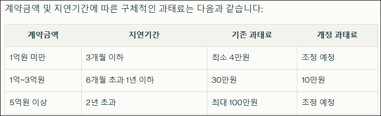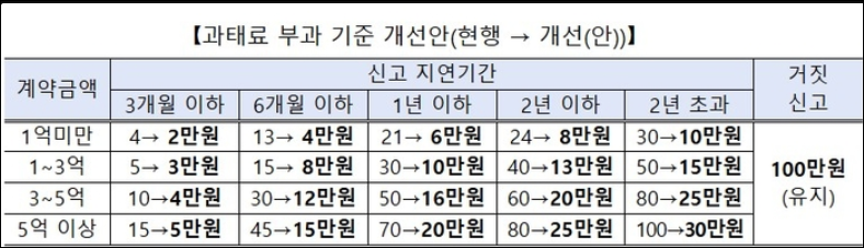 기존에는 계약금액과 지연기간에 따라 4만원에서 최대 100만원까지 과태료가 부과될 수 있었습니다. 그러나 개정된 시행령에 따르면, 단순 지연신고의 경우 최대 과태료가 30만원으로 제한됩니다. 예를 들어, 계약금액 1억~3억원 주택의 6개월 초과 1년 이하 지연신고 시 과태료가 30만원에서 10만원으로 낮아졌습니다