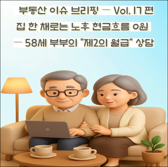 부동산 이슈 브리핑이 2주 동안 노후 자산으로 잠시 주제를 옮깁니다. 최근 많은 독자분들이 "집은 있는데 노후 현금흐름이 걱정"이라는 고민을 보내주셨거든요. 이번 Vol. 17 (상)과 다음 Vol. 18 (하) 두 편에 걸쳐, 부동산 외 현금흐름 설계의 기초를 다뤄보겠습니다. 그 후에는 다시 부동산 이슈로 돌아옵니다.