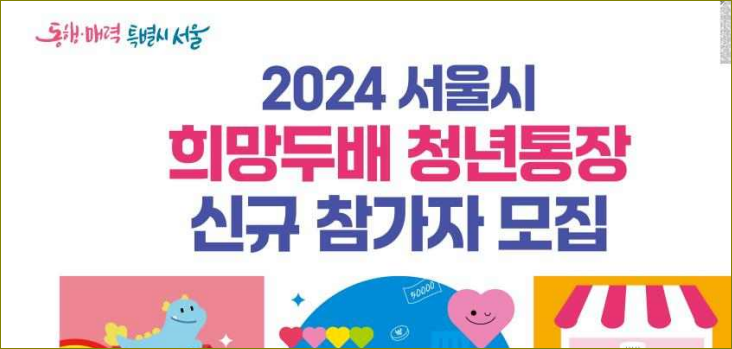 | 신청자격 | - 희망두배 청년통장 신청자격: 공고일 현재 ①∼⑤ 모두 해당하는 경우 ① 서울시 거주자 ※ 주민등록번호 부여자만 신청 가능(재외국인 및 재외국민 신청 불가) ② 만 18세 ~ 만 34세 청년 ※ 출생년월일이 1989. 1. 1. ~ 2006. 12. 31.인 자 ③ 공고일 기준 최근 1년간 3개월 이상(10일 이상 근로 시 1개월 인정) 근로하였거나 현재 3개월 이상 근로 중인 자 ※근로 종류 무관하나, 본 공고문의 증빙서류 제출 가능해야 함 ④ 본인 근로소득 세전 월평균 255만 원 이하(기준기간: 2023. 6. 1. ~ 2024. 5. 31.) ⑤ 부·모 (기혼시 배우자) 소득 연 1억(세전 월평균 834만원) 미만이고 재산 9억 미만 ※ 세대분리 여부 무관하게 부·모 합산, 배우자는 별도 적용(기준기간: 2023. 6. 1. ~ 2024. 5. 31.) |
