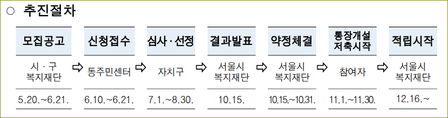올해부터는 온라인 신청 시스템을 도입하여 신청 절차를 간소화했습니다. 필요 서류도 기존 9종에서 5종으로 줄였습니다. 참여자는 서울시에 거주하는 만 18~34세 청년으로, 본인 소득이 월 255만 원 이하여야 하며, 부양의무자의 소득은 연간 1억 원 미만, 재산은 9억 원 미만이어야 합니다. 신청은 서울시 자산형성지원사업 누리집(account.welfare.seoul.kr)에서 온라인으로 하거나 거주지 동주민센터를 방문해 할 수 있습니다.