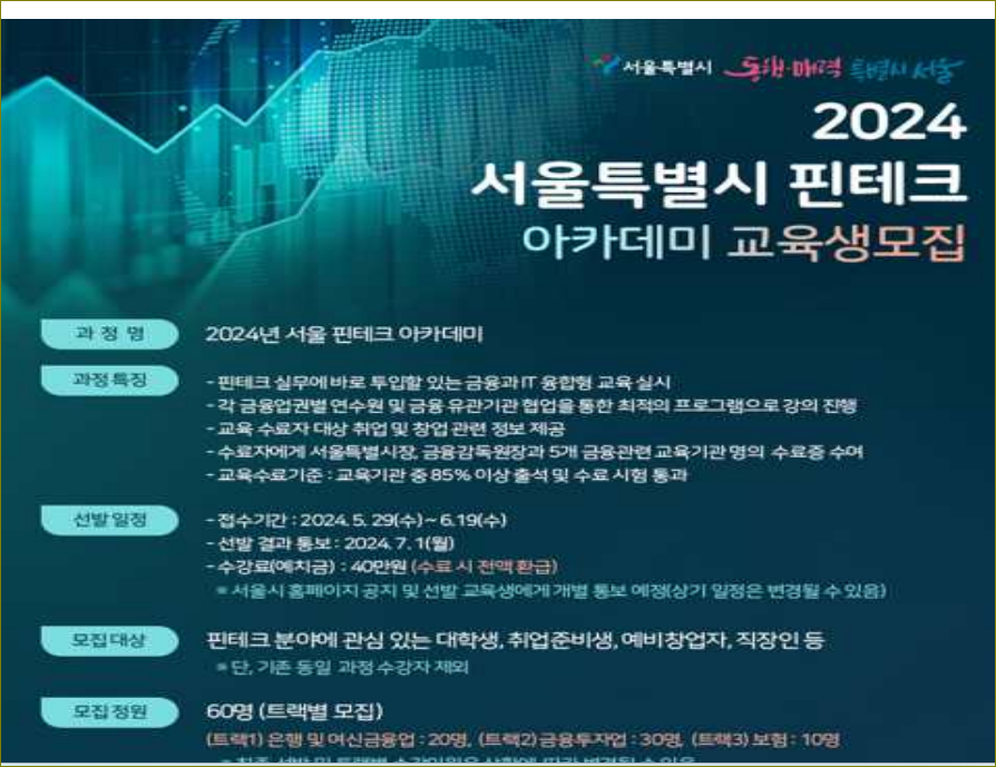 서울 핀테크 아카데미는 금융과 기술의 융합 시대에 맞춰, 관련 지식과 실무 경험을 겸비한 전문 인력을 양성하는 데 중요한 역할을 하고 있습니다. 관심 있는 분들의 많은 참여를 기대합니다.