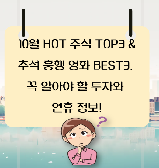 안녕하세요! 10월 투자할 주식과 놓치면 아쉬운 추석 극장가 흥행작을 쏙쏙 알려드립니다. 반도체 AI 섹터 중심 유망주 3개부터 가족맞춤 재미 보장 영화 TOP3까지, 지금 바로 최신 트렌드와 실체 데이터로 투자와 여행 계획 세워보세요! 🔥🎬